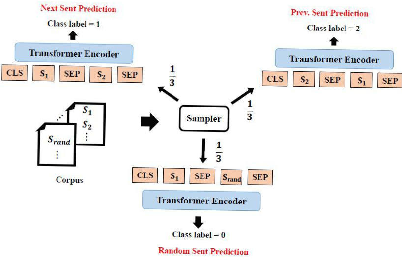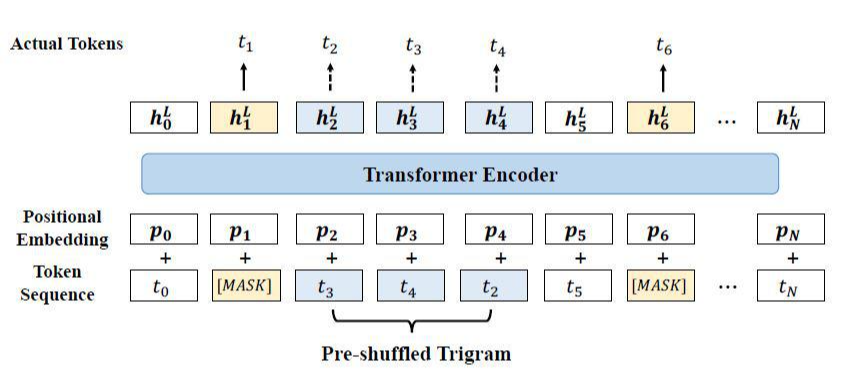 : 기존 BERT처럼 일부 토큰 masking 후, masked되지 않은 토큰 3개(trigram) 골라 순서 섞기
