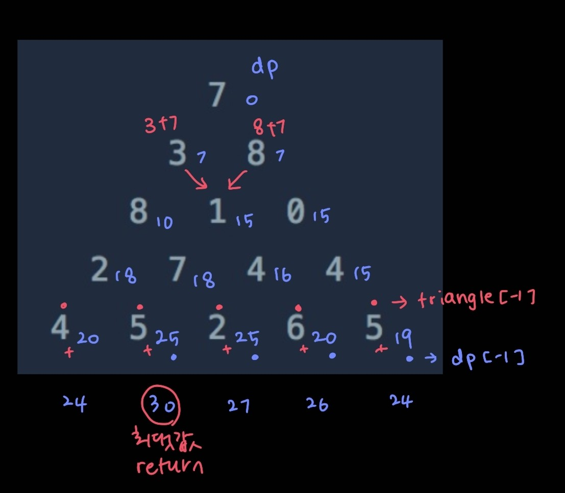 여기까지 실행하면 dp의 마지막 줄엔 triangle의 마지막 줄의 각 위치에 도달할 때까지의 최댓값이 저장되어 있습니다. 이 값들을 각각 triangle의 위치에 해당하는 값과 더해주면, 각 위치에서 가능한 최종적인 합의 최댓값을 구할 수 있습니다. 이 리스트의 최댓값을 반환하면 정답을 얻을 수 있습니다.