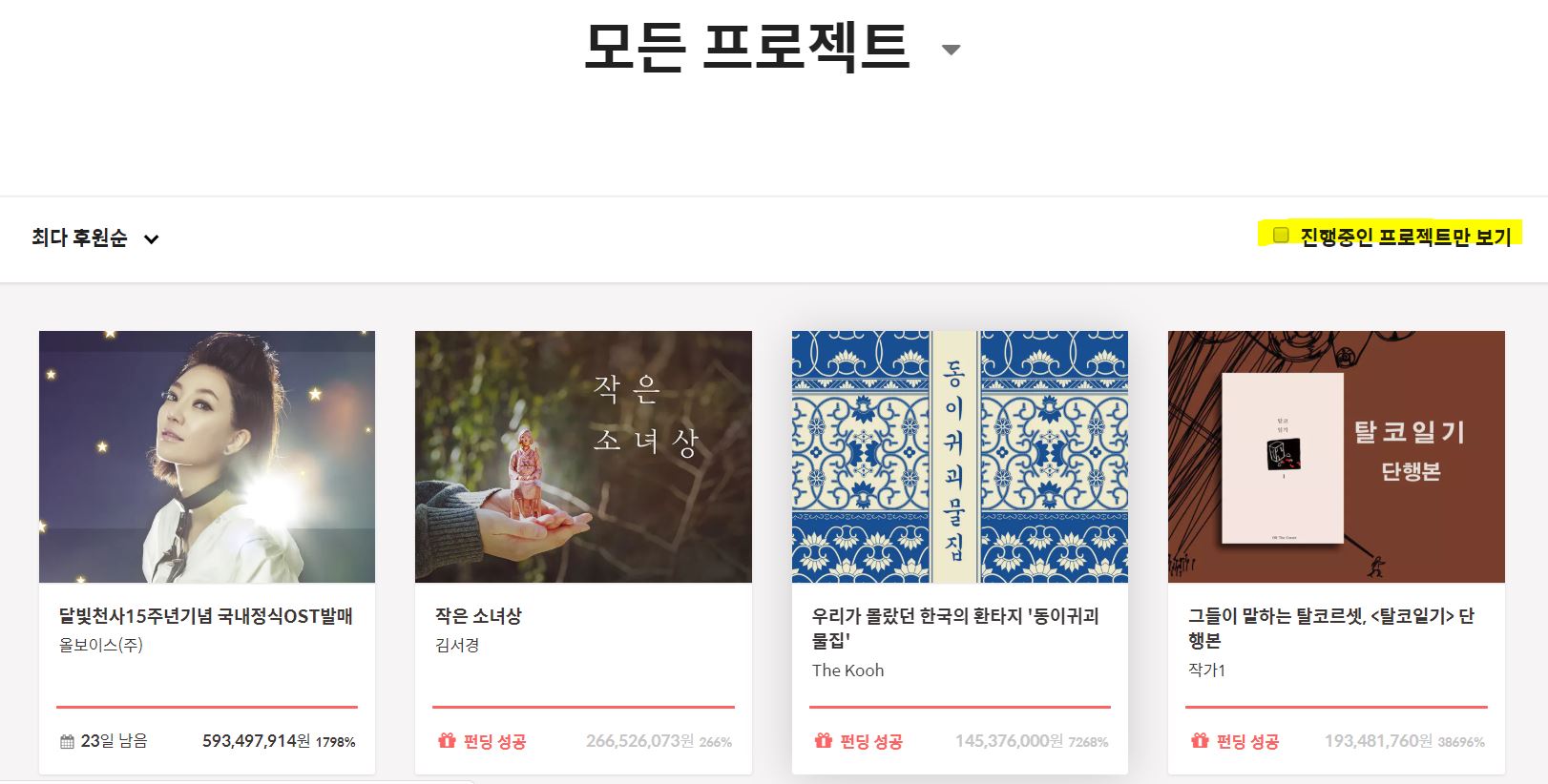 펀딩중인 프로젝트는 관심없고 펀딩 성공한 프로젝트의 이름만 보고 싶다.