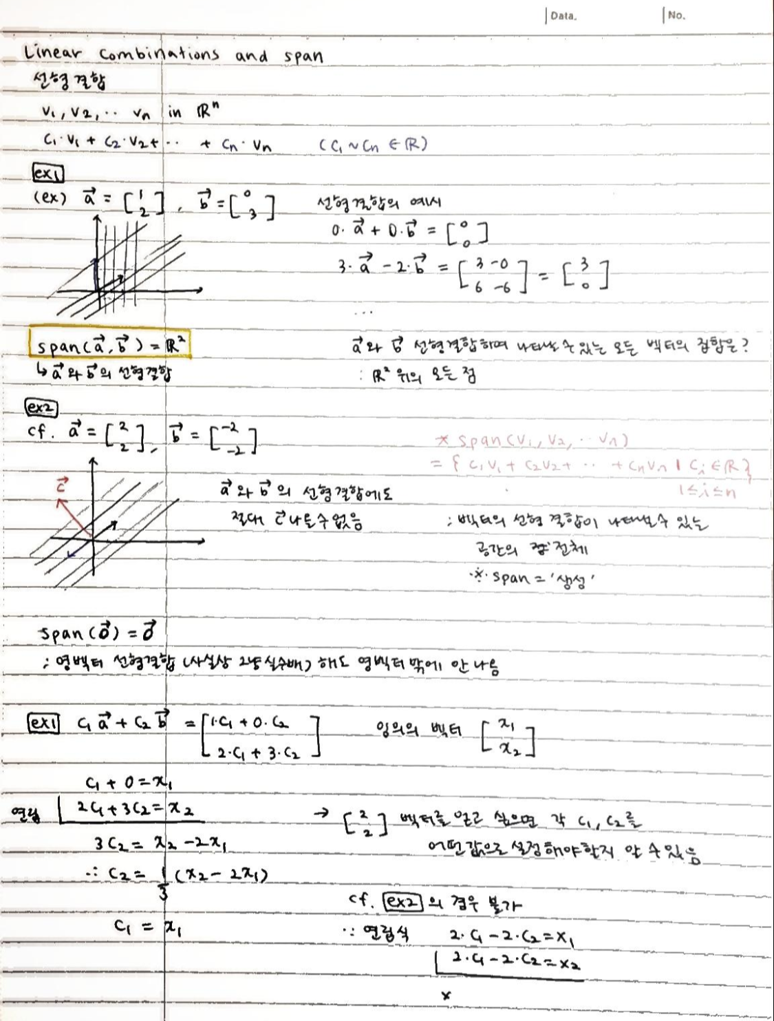 • span(v1, v2) = { c1*v1 + c2*v2 + ... + cn*vn | c ∈ R } = v1과 v2의 선형 결합으로 나타낼 수 있는 공간의 전체