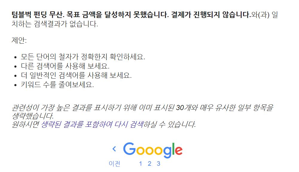 구글에 "텀블벅 펀딩 무산. 목표 금액을 달성하지 못했습니다. 결제가 진행되지 않습니다."라고 검색하면 펀딩에 실패한 프로젝트들이 쫙 뜬다.