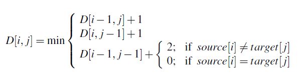 editing operation : insertion(1), deletion(1), substitution(2) (괄호 안은 각 operation의 cost, Levenshtein)