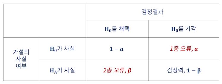 - 유의수준 : 얼마나 드물면 귀무가설 reject할 지 미리 정해놓은 값, 일반적으로 0.05