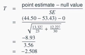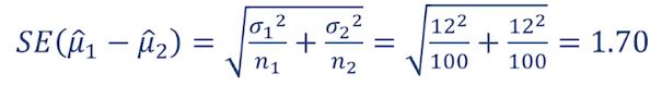 - 두 평균의 차이가 1.96 * SE = 1.96 * 1.70 = 3.332보다 크면 유의수준 α = 0.05에서 귀무가설을 기각한다