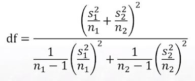 - 이 경우 test statistic은 (근사)자유도가 다음과 같은 t분포를 따른다