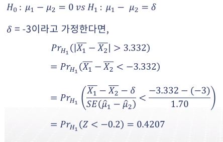 - 대립가설 하에 이런 결과를 관측할 확률이 42%이다 (=검정력이 42%)