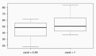 - 1캐럿의 평균 가격이 0.99캐럿의 평균 가격보다 비싸다 (T값이 마이너스니까)