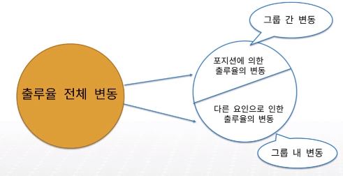 - 대립가설 : 포지션별로 평균 출루율의 차이가 있다 (최소 두 그룹끼리는 차이가 있다)