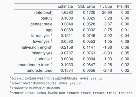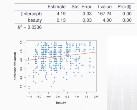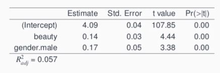 → 외모가 같다는 가정 하에 남성 교수가 여성 교수보다 강의점수가 0.17점 만큼 높다
