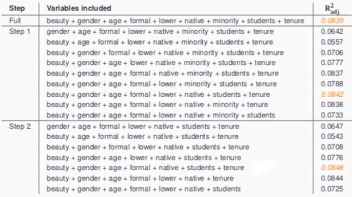 - adjusted R^2 가 증가하지 않을 때까지 반복하며 변수 drop