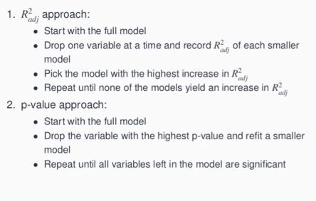 - adjusted R^2 가 증가하지 않을 때까지 반복하며 변수 drop