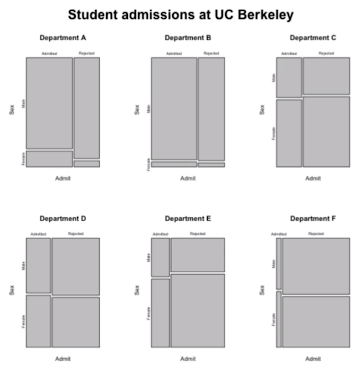 하지만 입시결과를 학과별로 나누어서 분석한 결과 대부분의 학과에서 오히려 여학생들의 합격률이 높다는 게 밝혀졌다. 즉, 전공이 교란변수였다.