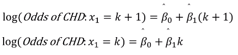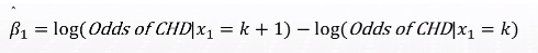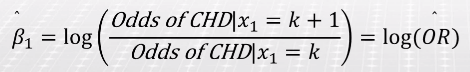 - 추정된 회귀계수 베타1(=0.135)이 양수이다. 즉 나이와 log(Odds of CHD)는 양의 관계가 있다