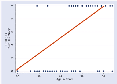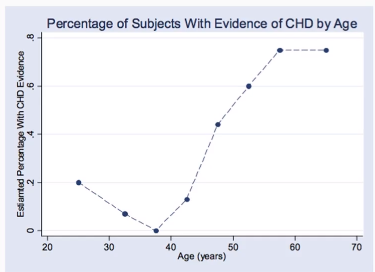 병원환자 중 58명을 대상으로 관상동맥 심장질환여부와 나이를 조사한 결과 연령층은 20-64세였고, 이 중 43%가 관상동맥 심장질환을 앓고 있었다
