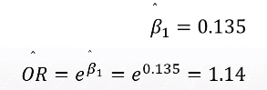 - 만약 우리가 한 살 차이 나는 2개의 그룹을 비교한다면 한 살 많은 그룹이 젊은 그룹에 비해 심장질환을 가질 오즈비의 추정치가 1.14이다
