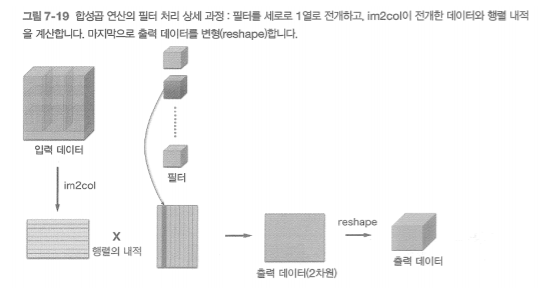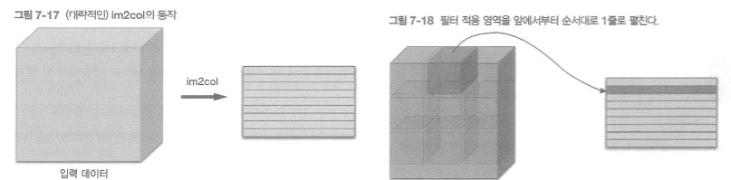 - Im2col로 데이터 전개 → 내적 계산 → reshape