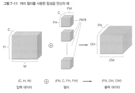 - 여러 필터 사용하면 출력의 채널은 필터 개수만큼