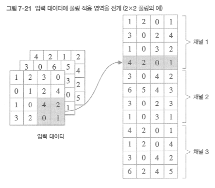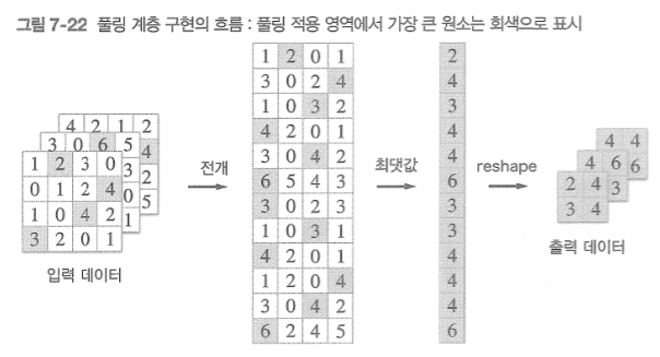 - 입력 데이터에 풀링 적용 영역 전개 후 최댓값/평균 구하고 reshape