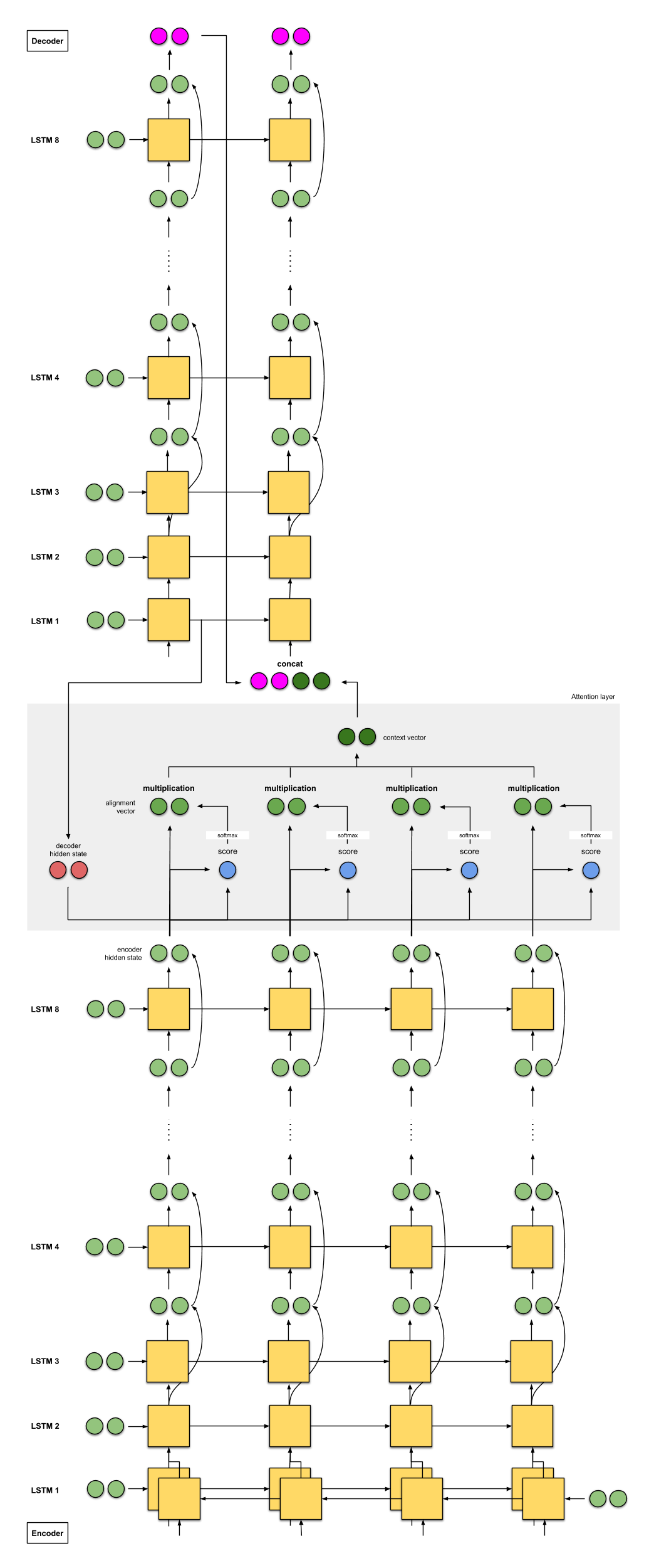 - Enocoder : 8 LSTMs (첫번째 LSTM은 Bidirectional)