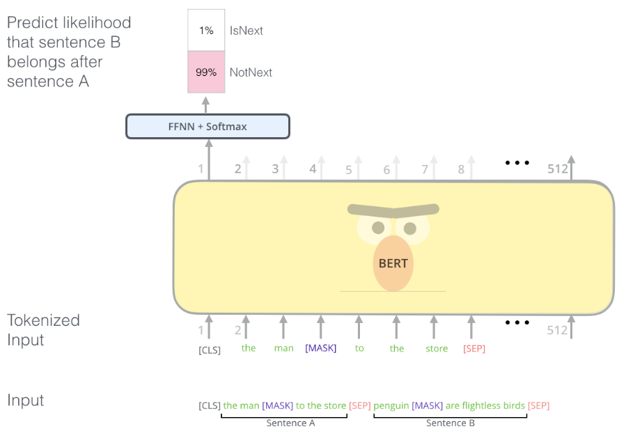 - BERT는 두 문장의 관계를 학습하기도 함. 문장 B가 문장 A 다음에 오는가?