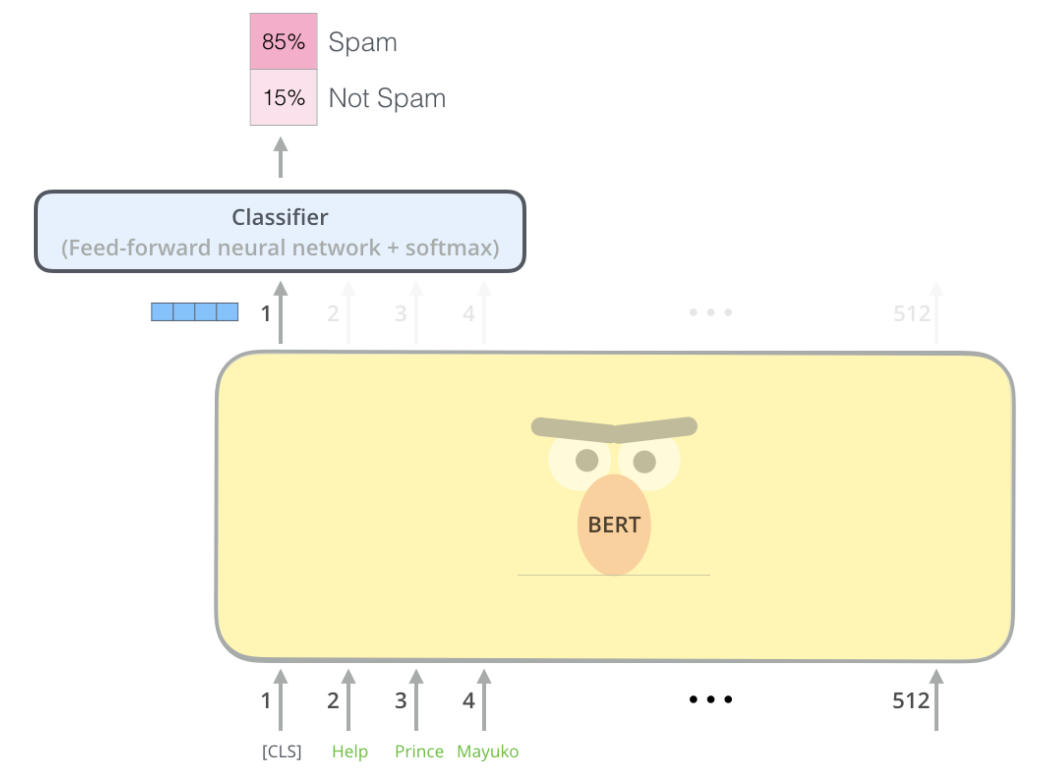 - [CLS] 토큰의 BERT output은 Classifier를 거쳐 각 class에 속할 확률을 알려줌