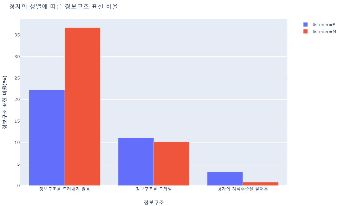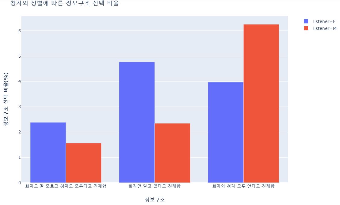 - 청자가 남성일 때, 청자가 여성일 때보다 정보구조를 드러내지 않는 경우가 많았다. p값 < 0.05