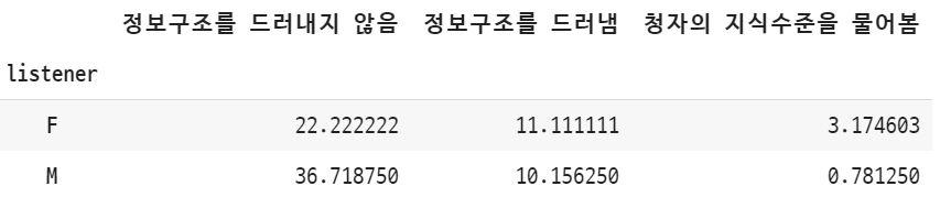 - 앞의 두 경우는 남성 청자보다 여성 청자의 비율이, 세번째 경우는 여성 청자보다 남성 청자의 비율이 더 높았다.