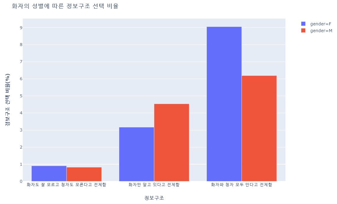 fig.update_layout(title="화자의 성별에 따른 정보구조 선택 비율", yaxis_title = "정보구조 선택 비율(%)")