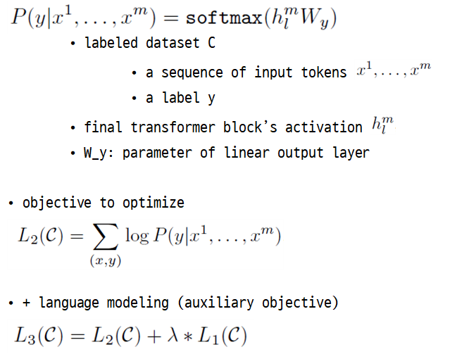 • generative pre-training (unlabeled text) + discriminative fine-tuning (labeled text)