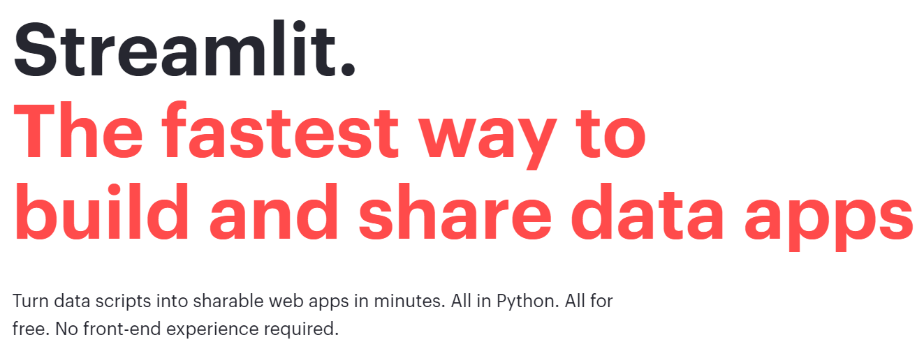 Streamlit is an open-source app framework for Machine Learning and Data Science teams. Create beautiful data apps in hours, not weeks. All in pure Python. All for free.