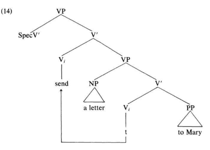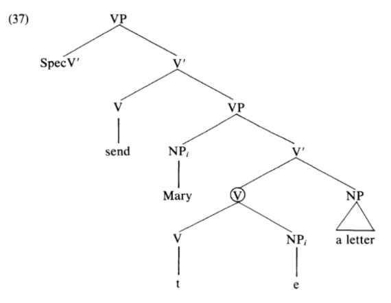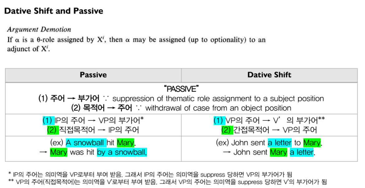 - Burzio's Generalization: verb가 의미상 V' object(간접목적어)에 격 부여 막음 → 그 verb는 VP 주어(직접목적어)에 의미역도 부여할 수 없음