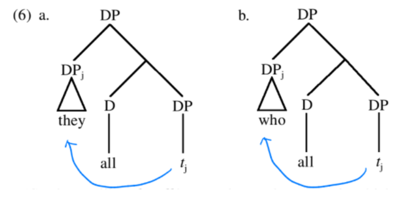 - → who는 (they와 달리) VP-internal subject position에서 바로 CP의 specifier로 이동 (TP의 specifier 거치지 않음)