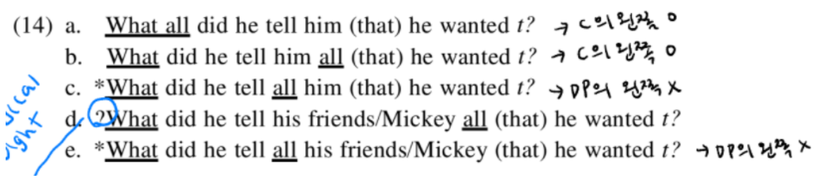 - tell은 DP, CP complement 가짐. stranding all은 DP의 오른쪽, C의 왼쪽에만 올 수 있음