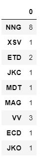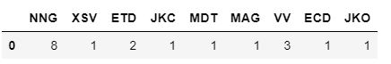 Counter({'NNG': 8, 'XSV': 1, 'ETD': 2, 'JKC': 1, 'MDT': 1, 'MAG': 1, 'VV': 3, 'ECD': 1, 'JKO': 1})