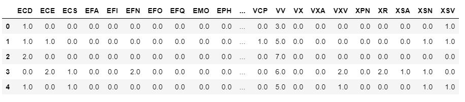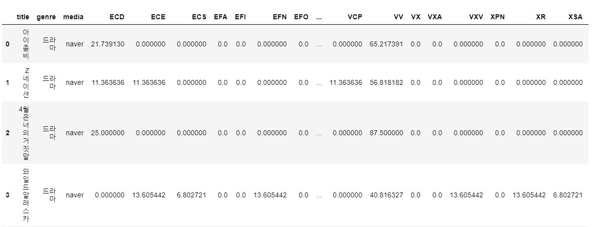 넷플릭스와 네이버에서 203개 드라마, 932개 영화에 대한 시놉시스를 크롤링했다. 이제 각 시놉시스에 특정 품사가 얼마나 많이 쓰였는지 알아보려고 한다. PCA 분석도 하려면 다음과 같은 형식의 데이터를 만들어야 한다.
