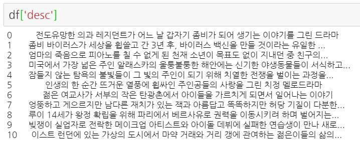 우선 크롤링한 데이터에서 시놉시스에 해당되는 칼럼만 불러온다.