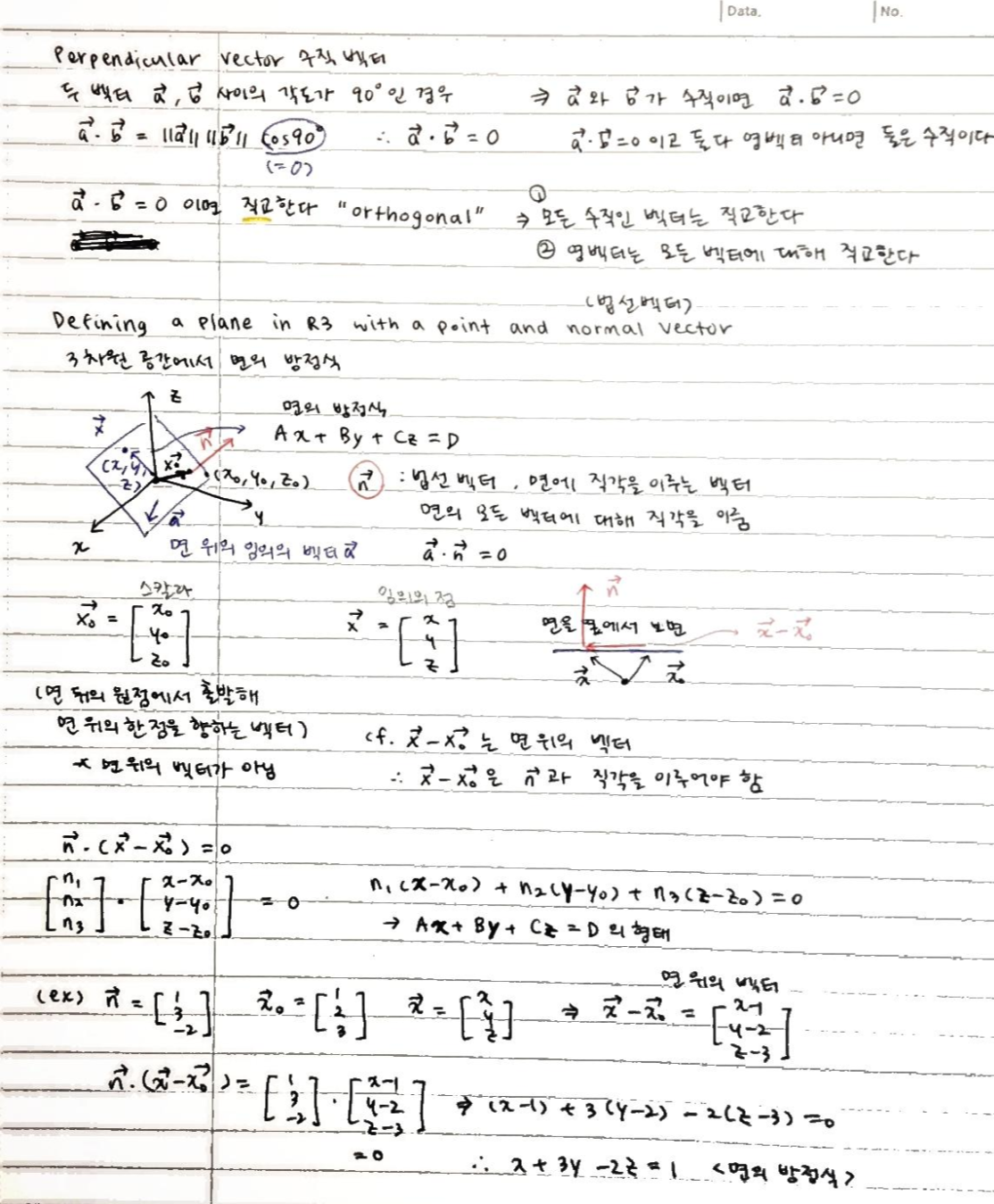 a ⋅ b = 0 이면 벡터 a,b는 직교(orthogonal)한다.