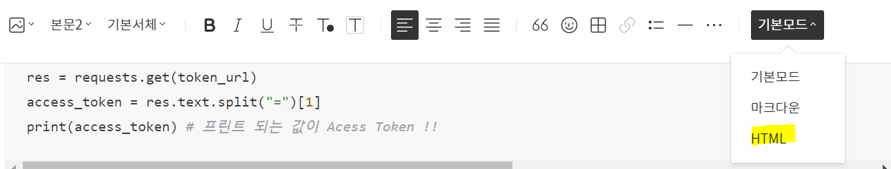 HTML 눌러서 현재 글의 HTML 코드를 확인할 수 있다.