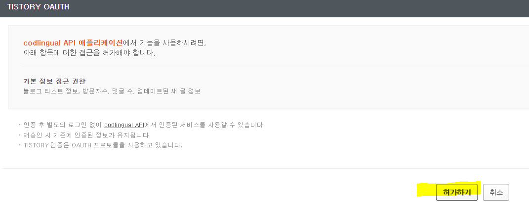 허가하기 누르면 본인 블로그로 보내진다. 이때 그 상태에서 주소창의 주소를 복붙해오자.