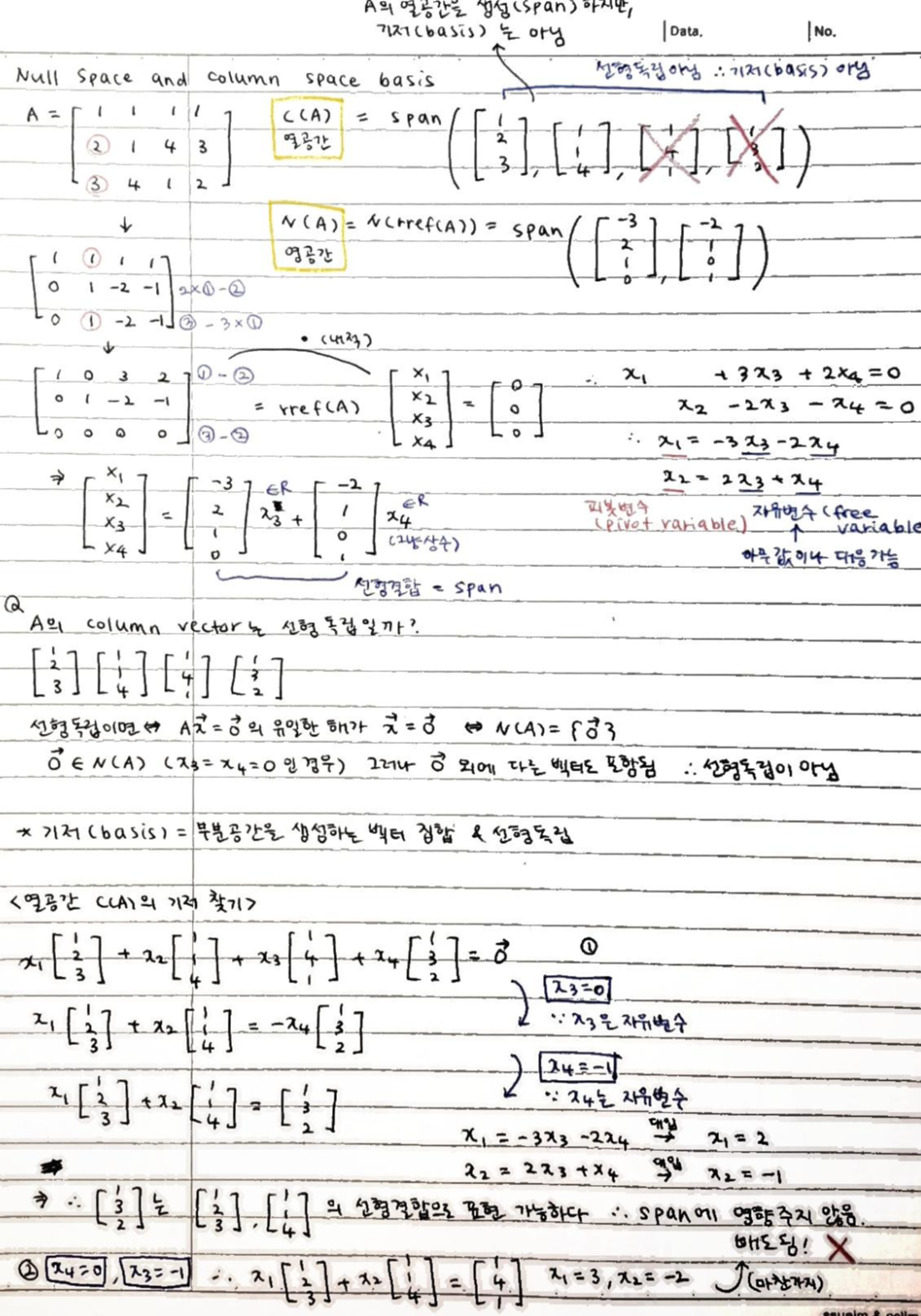 * A의 열공간, C(A)의 기저 구하기 : rref(A)를 구한 뒤 피봇변수와 곱해지는 column 찾기. 이 칼럼들의 생성(span)이 열공간의 기저