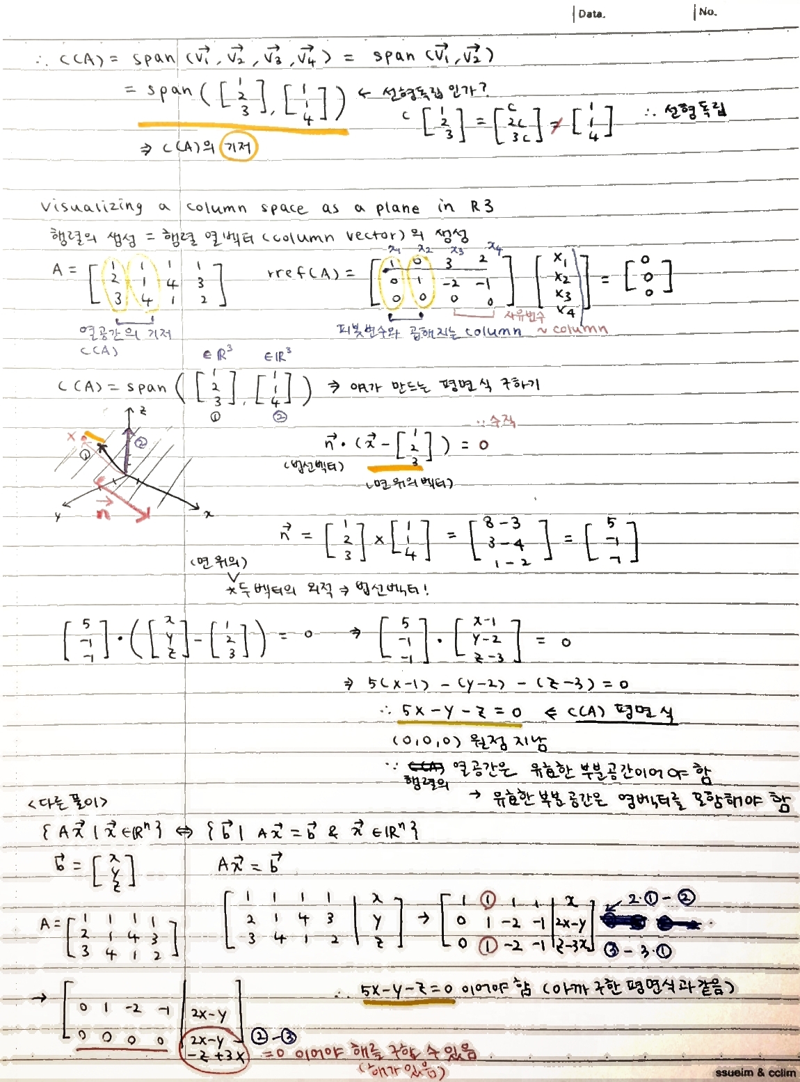 열공간의 기저가 만드는 평면의 식 구하기