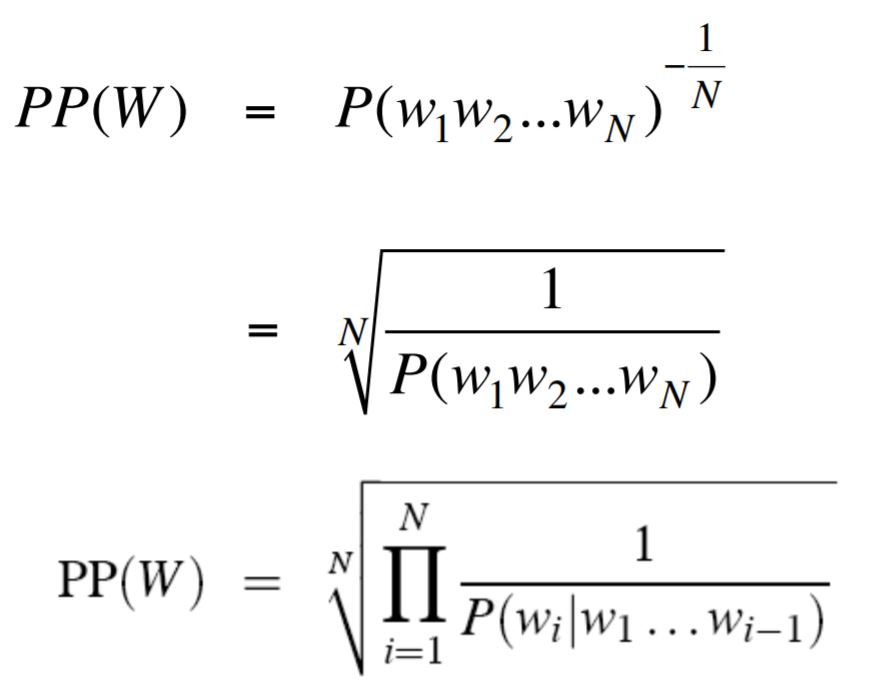 2) Intrinsic Evaluation : 모델의 혼잡도(perplexity) 측정하기 (혼잡도 낮을수록 확률 높은 것 ∴혼잡도 낮은 모델이 좋은 모델)
