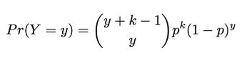 - 만약 Y = X - k , 즉 k번째 성공을 관측하기 전까지 실패횟수라고 한다면 음이항분포의 확률밀도함수는 다음과 같다