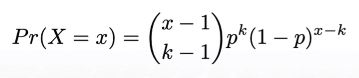 - k번째 성공을 관측할 때까지 총 시행횟수가 x일 확률은?
