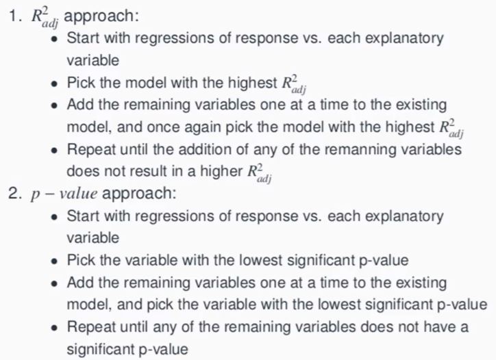 - adjusted R^2 가 최대인 모델 선택하고 adjusted R^2 가 증가하지 않을 때까지 반복하며 변수 추가