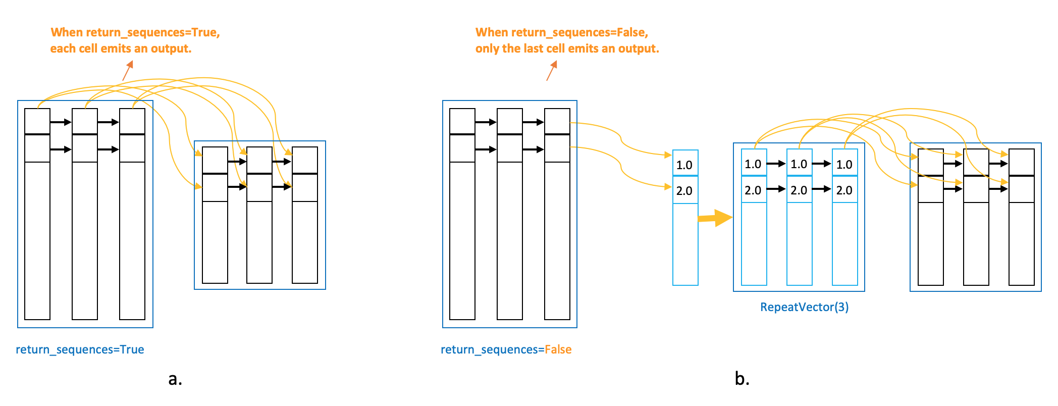 - return_sequences=True : 모든 time-stamp에서 신호를 전달함 (모든 time-stamp가 각자의 time-stamp에 전달)
