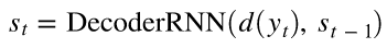 - DecoderRNN은 각 time-stamp마다 현재 단어인 d(y_t)의 임베딩 + 이전 time-stamp의 은닉상태인 s_(t-1)을 입력 받음